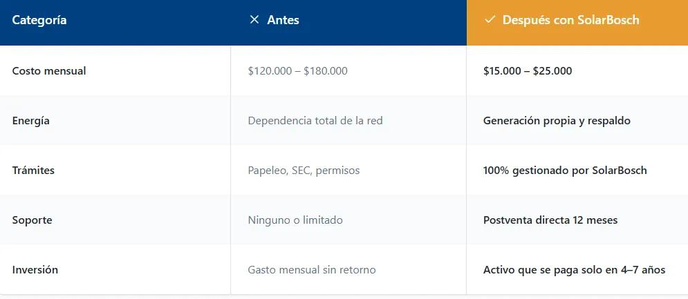 "Vivo en una parcela en Pichilemu y los cortes eran diarios. Desde que instalamos el sistema híbrido, nunca más se apagó nada."